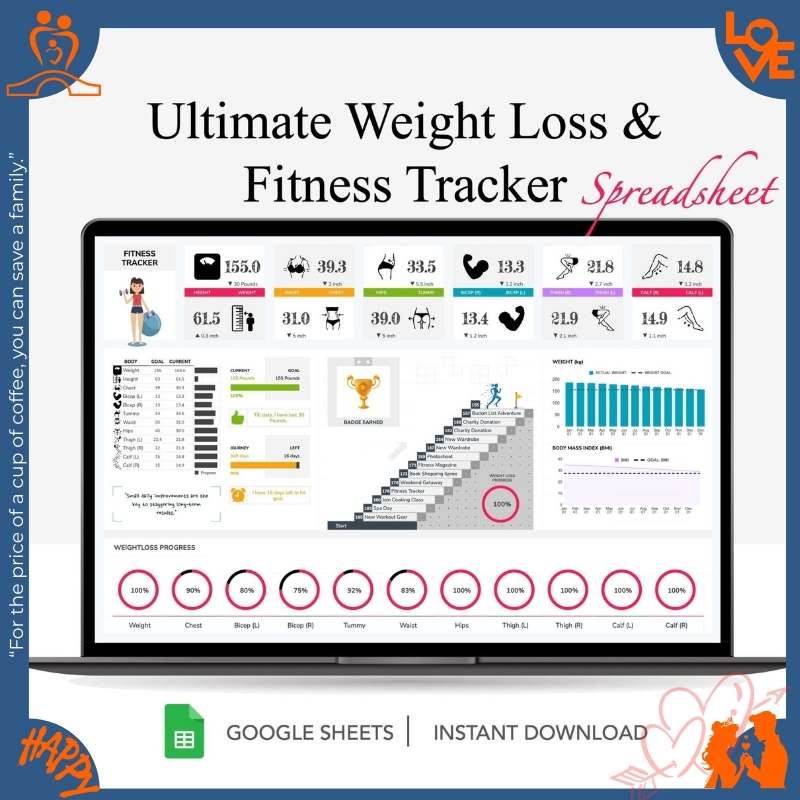 Weight Loss & Fitness Tracker Spreadsheet for Google Sheets, Meal Planner, Calorie Tracker, Digital Workout Planner, Body Measurement Chart V4.2.3