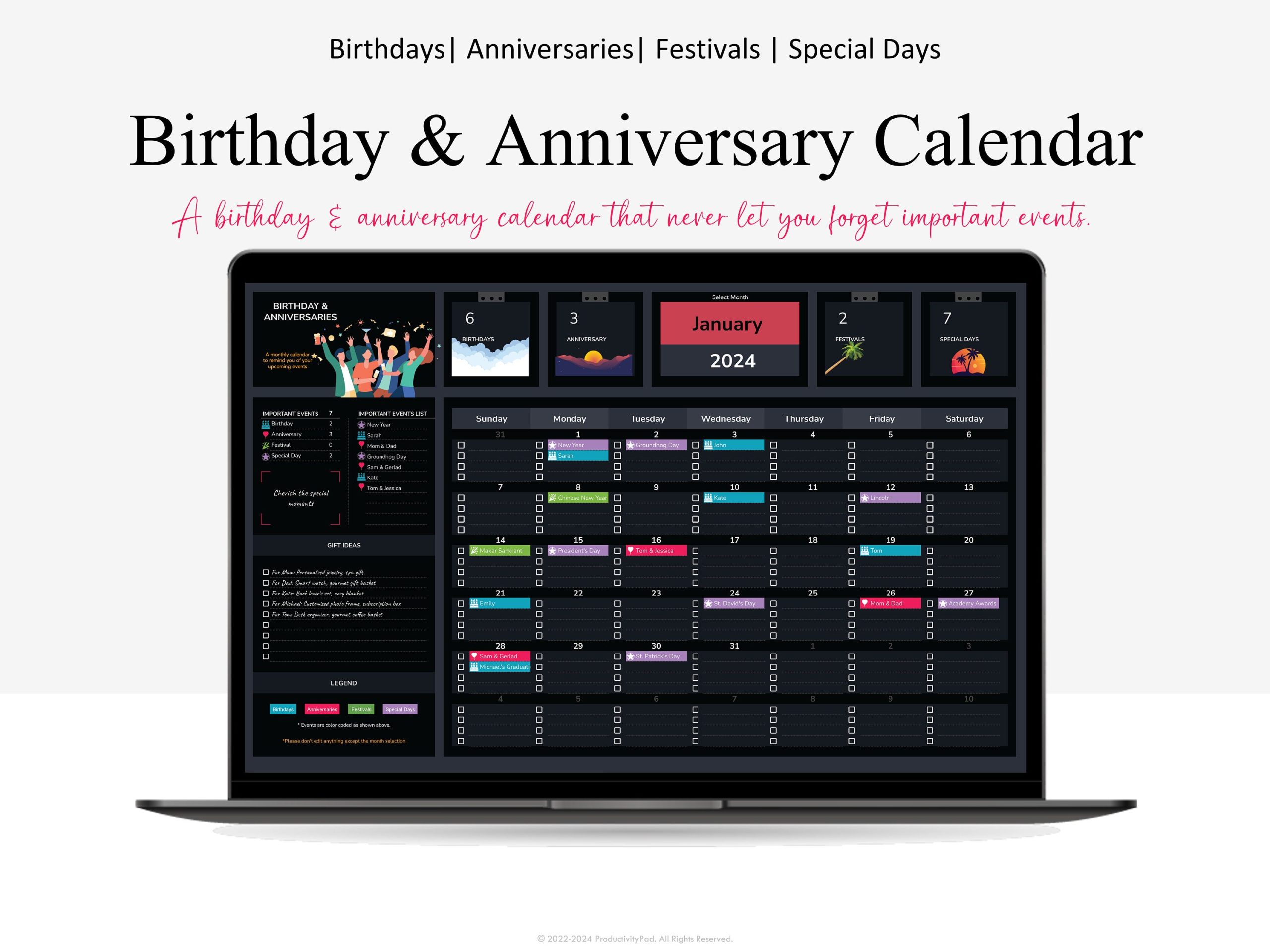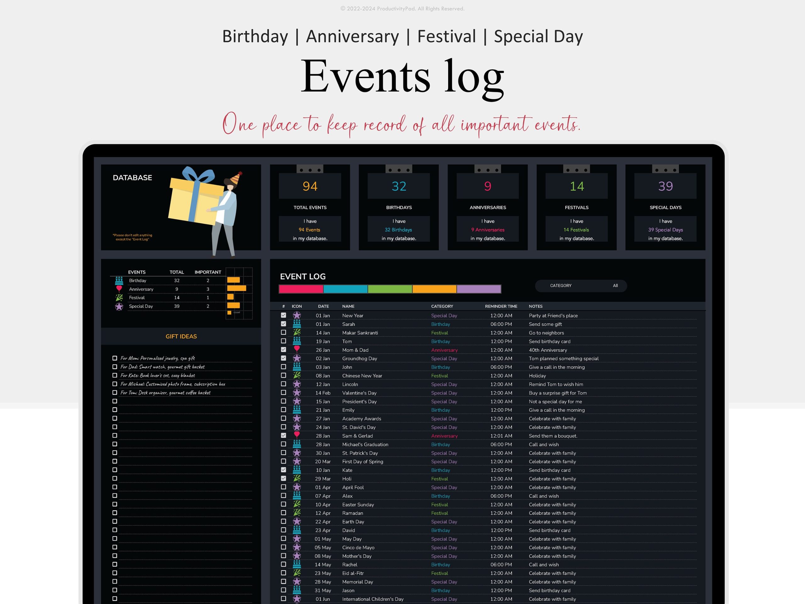 The Birthday & Anniversary Tracker ensures you never miss another important date. See upcoming events at a glance (7/30/90 days), track gift ideas, organize by relationship, and stay on top of every birthday and anniversary. Simple. Automatic. Foolproof.