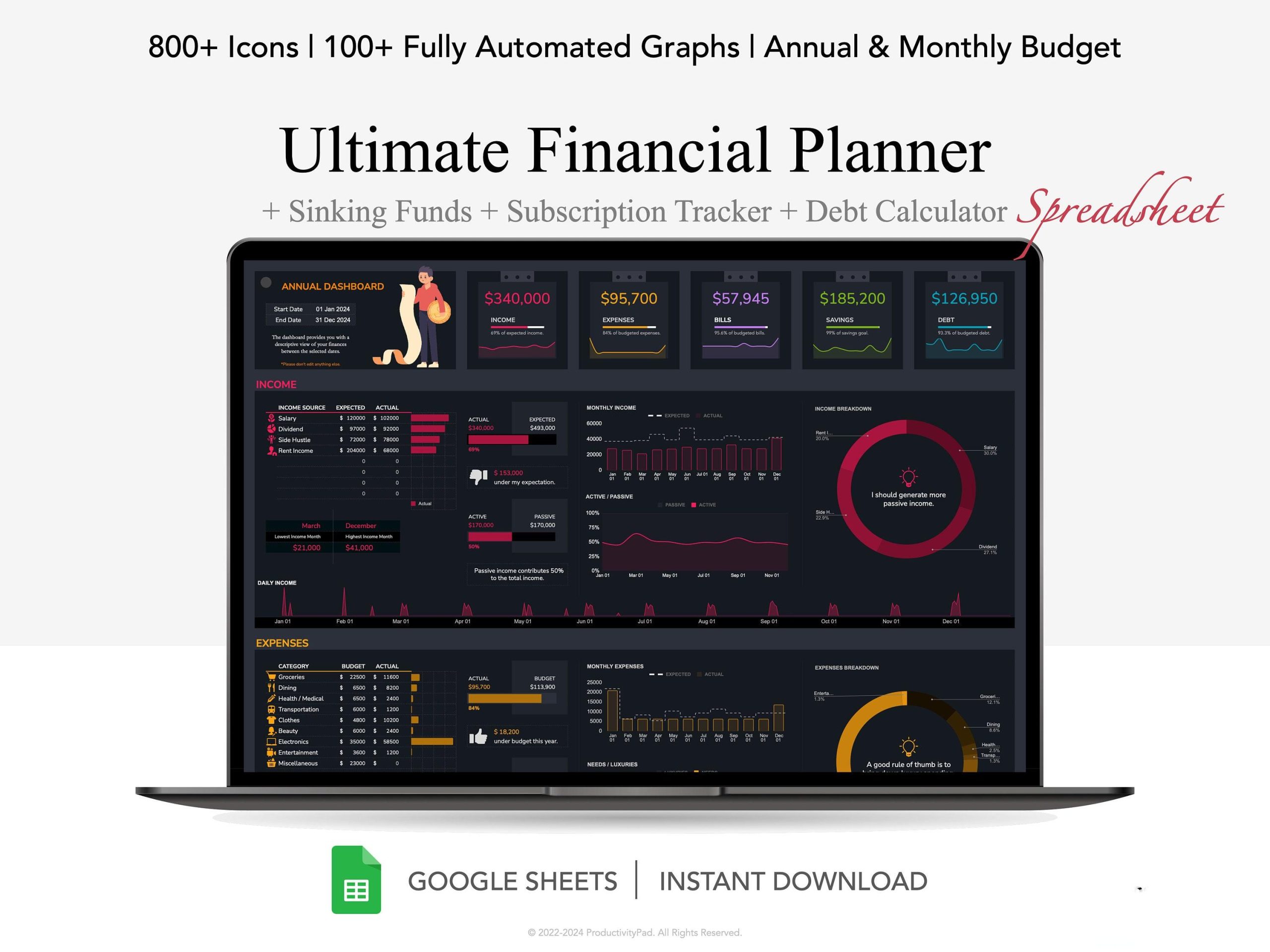 Annual and Monthly Budget Planner for Google Sheets, Debt Payoff Tracker Google Sheets, Financial Planner V2.8.6
