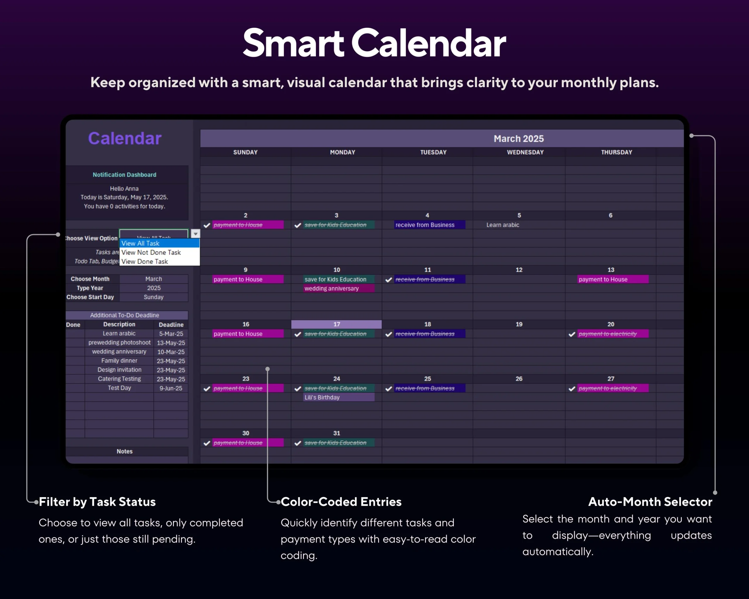 - ✅ Pre-set monthly tabs (Jan–Dec, plan entire year)