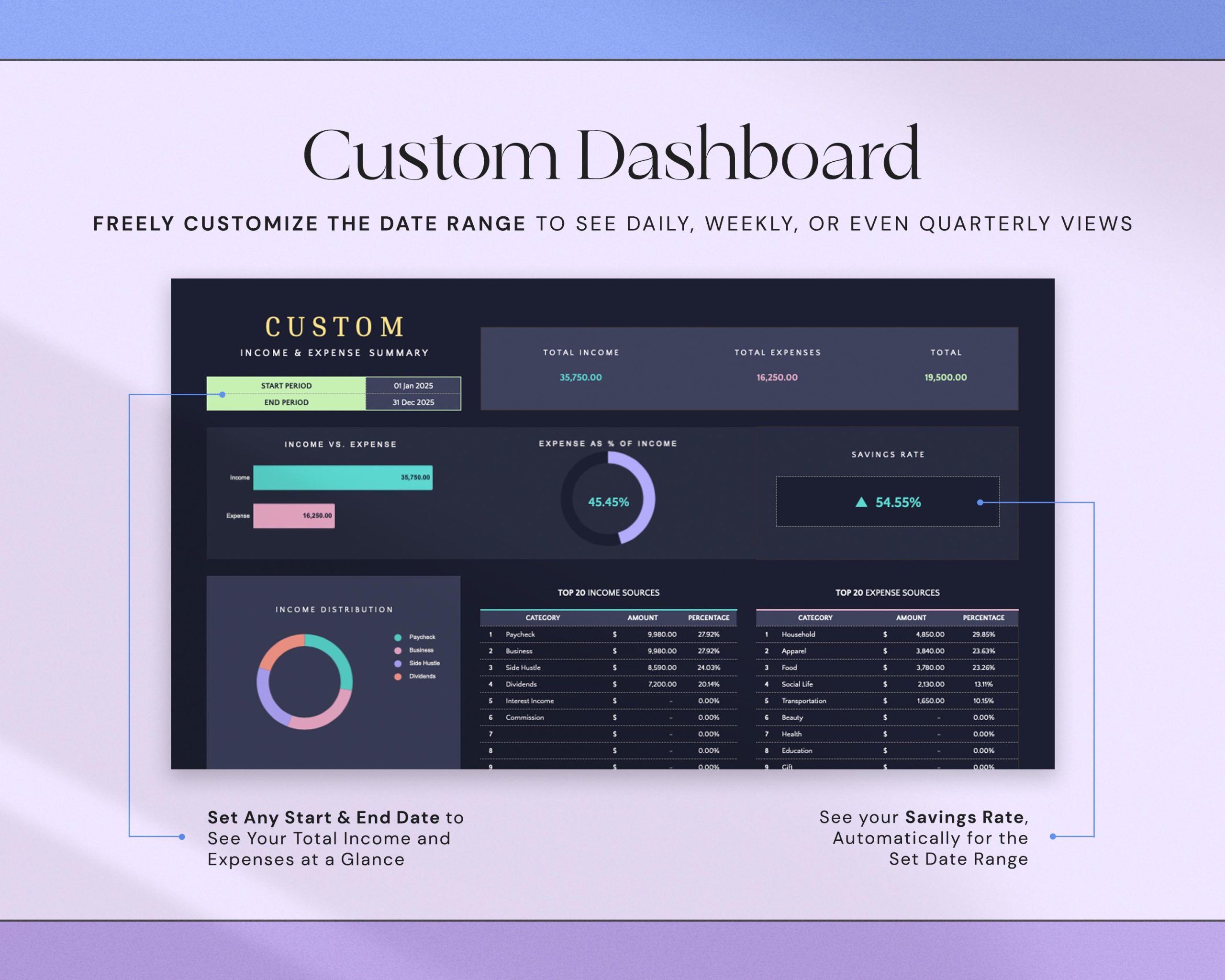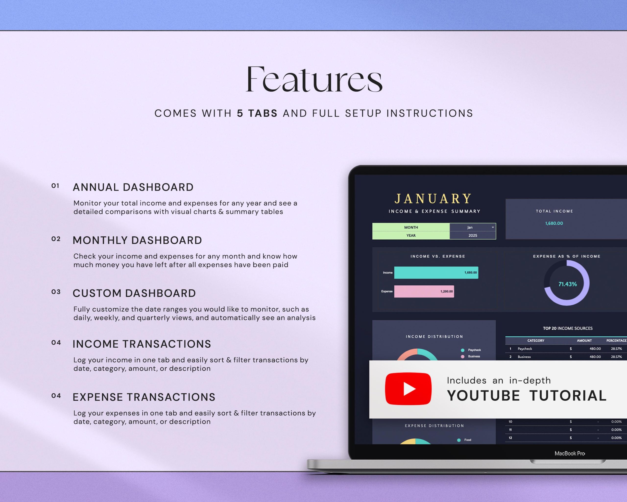 The Income & Expense Tracker gives you complete financial clarity. Track every dollar earned and spent, see income vs expenses at a glance, automatically calculate profit/loss, and visualize your financial health with charts. Simple. Powerful. No accounting degree required.